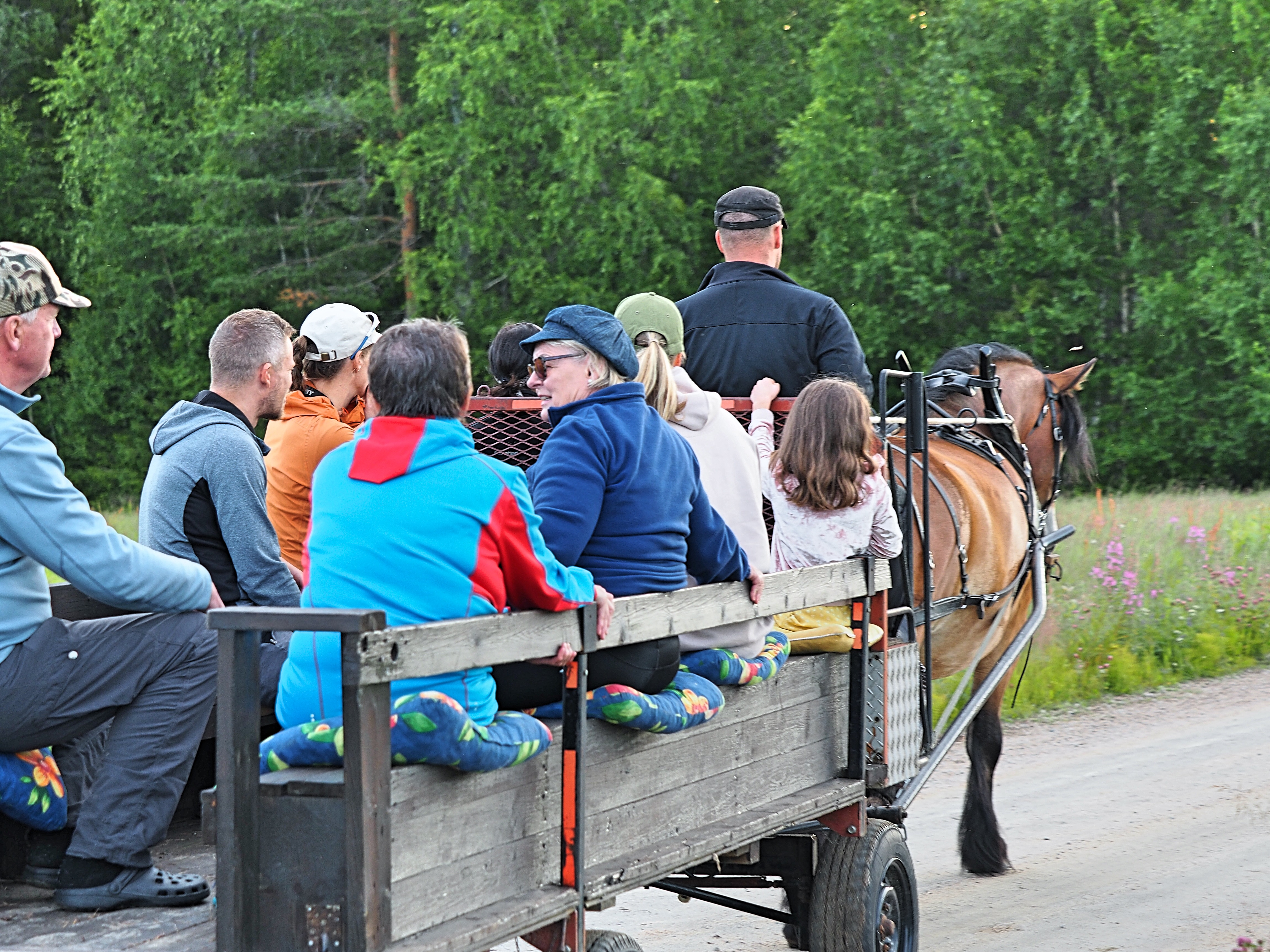 We start by preparing the horse for a carriage ride. The horse is of the breed north Swedish draft horse, an old Swedish country breed and we are happy to tell more about the breed’s origin and history for the curious. Then we go on a tour through the village, parts of the tour go close by the Kalix river and offer magical views of nature and flowing water. When we return to the farm, we end with “Swedish fika” (coffee / tea / juice and snacks). In rainy weather we enjoy it indoors in the farm’s summer cottage.